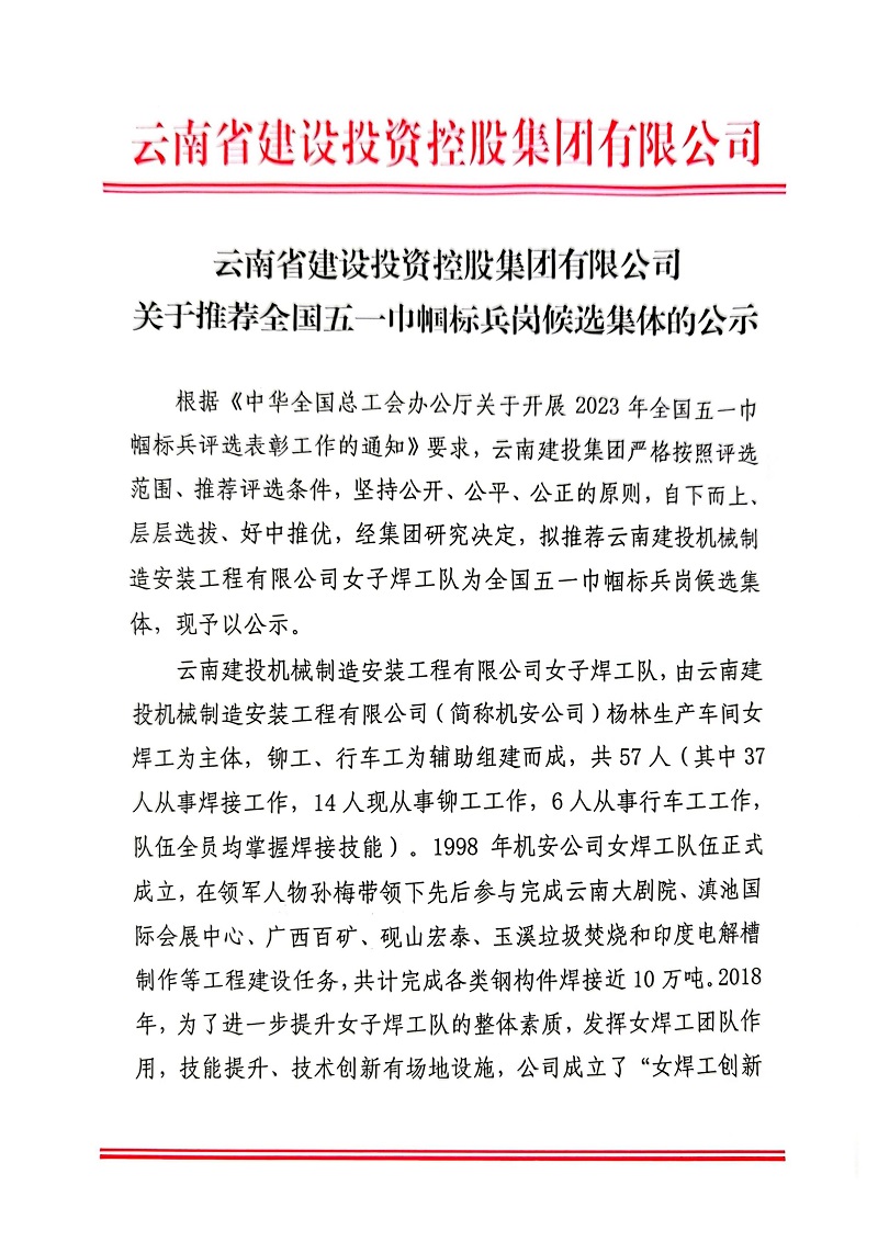世界杯官网合作平台控股集团有限公司关于推荐全国五一巾帼标兵岗候选集体的公示