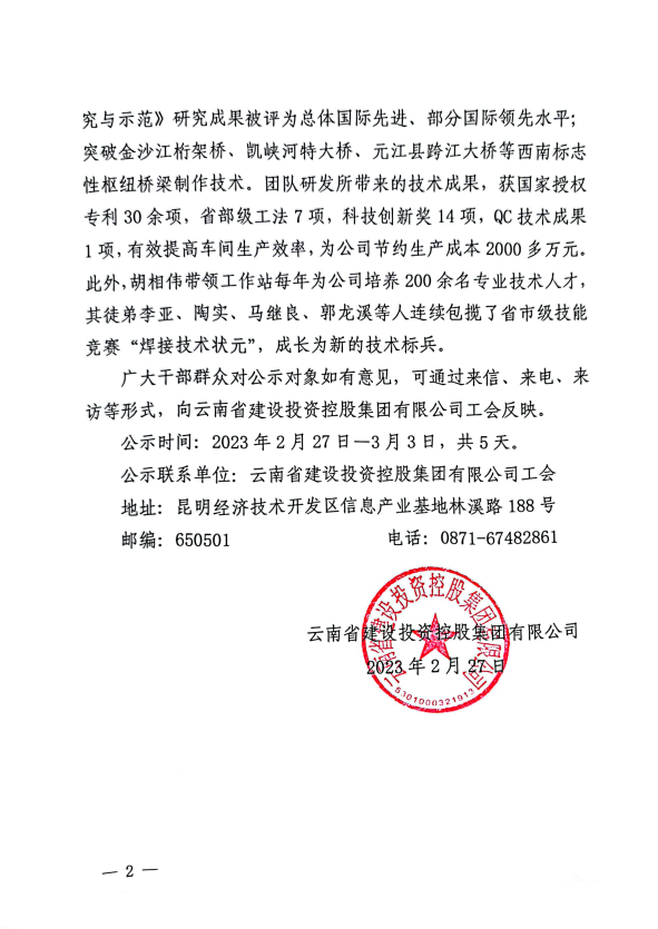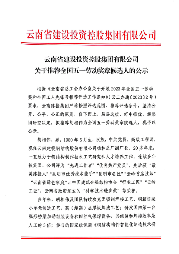 世界杯官网合作平台控股集团有限公司关于推荐全国五一劳动奖章候选人的公示