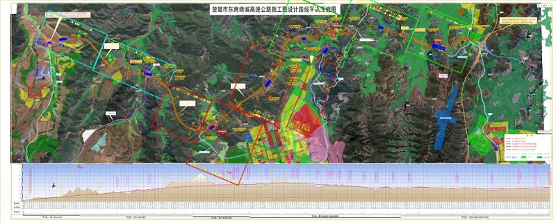 楚雄市东南绕城高速项目主线27.9公里,采用双向四车道,设计时速80公里/小时,路基宽25.5米,互通立交4座,3座匝道收费站。连接线3条共8.41公里。主线桥梁46座共19156.08米,隧道3座共 5387.5 米,桥隧比 53.64%。