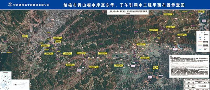 青山嘴水库至东华、子午引调水工程以青山嘴水库为水源,通过新建输水管道和加压提水泵站将水引至东华、子午片区,主要建设内容包括新建输水管道30.8千米和加压提水泵站一座,提高供水保证率,保障规划区灌溉最基本用水需求,形成以青山嘴水库水源为核心,多库互相串连、联合调度的供水体系。供水体系采用管道的输水方式连通,由输水主管工程、输水支管工程、提水工程组成。输水主管总长19.92千米,输水支管共有4条,朵基水库支管从朵基村分流至朵基水库结束,支管长1.29千米。提水泵站由取水口、进水管、泵站厂房、出水管和高位水池组成。