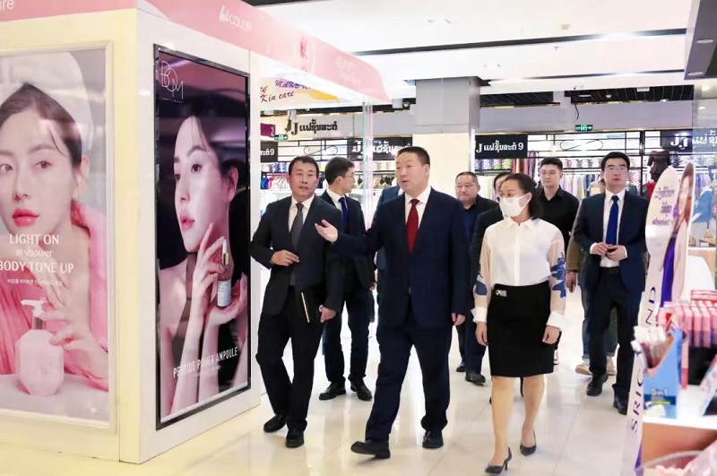 在万象国际商业旅游中心,陈祖军深入了解万象中心项目开发经营和招商引资现状,听取了老挝万象中心大众公司经营发展情况的汇报,并实地调研了万象中心商场内百货、展览、餐饮、广告等主要业态。