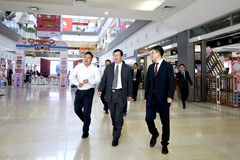 在万象中心,李晨阳听取了项目开发情况和目前经营情况的介绍,参观了商场内百货、展览、餐饮、广告等主要业态,对项目工作人员表达了亲切问候,鼓励运营团队要不断巩固经营成果、提升商业品牌,持续为中老经贸合作和民间友谊作出贡献。