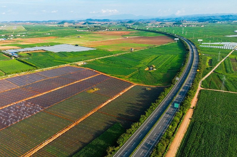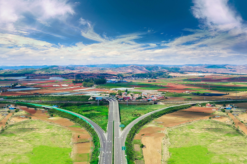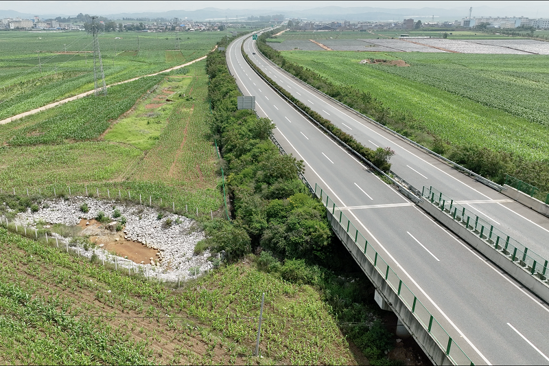 为防止喀斯特地貌石漠化,桥梁蜿蜒穿梭于山谷间,隧道采用削竹式零开挖进洞方式,最大限度减少对山体开挖、生态的破坏。为防止粉尘影响三七及周边农作物生长,采用爆破开采低风尘风化料填筑、配合洒水抑尘,最大限度降低粉尘污染。