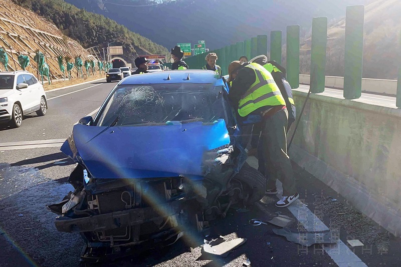 1月24日,香丽高速下行K49+550处一辆一型客发生单方肇事,驾驶员被困车里,隧管员发现情况后立即组织开展救援工作,及时将被困人员救出,恢复道路通行。