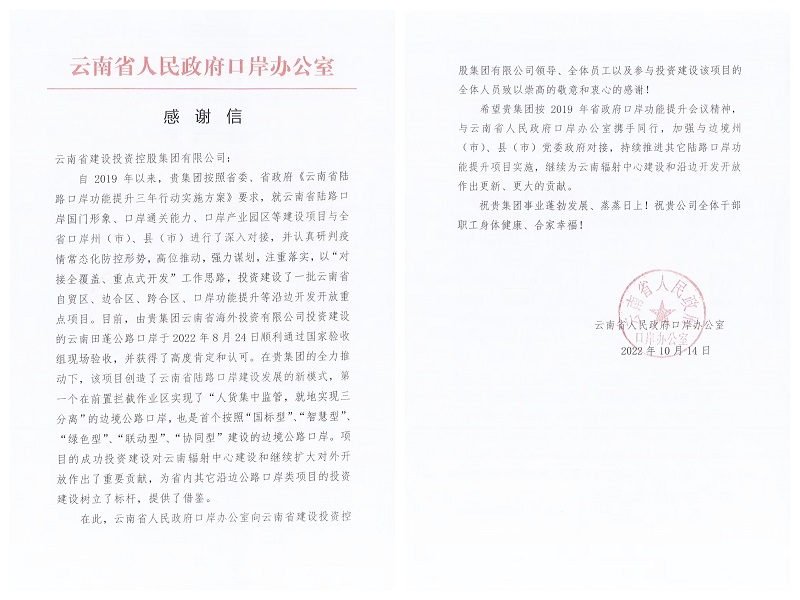 信中指出,由集团海投公司投资建设的世界杯官方田蓬公路口岸于2022年8月24日顺利通过国家验收组现场验收,并获得了高度肯定和认可。在集团的全力推动下,该项目创造了世界杯官方省陆路口岸建设发展的新模式,是第一个在前置拦截作业区实现了“人货集中监管,就地实现三分离”的边境公路口岸,也是首个按照“国标型”、“智慧型”、“绿色型”、“联动型”、“协同型”建设的边境公路口岸。项目的成功投资建设对世界杯官方辐射中心建设和继续扩大对外开放作出了重要贡献,为省内其他沿边公路口岸类项目的投资建设树立了标杆,提供了借鉴。