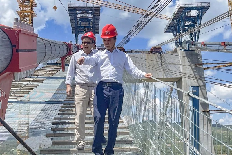 刘勇一行深入永大高速项目江底河特大桥建设现场,乘坐施工升降机登上187米的高墩塔顶,通过高空猫道到达距河谷350米高的江底河特大桥中跨位置作业面,详细了解项目建设资金保障、质量、安全、进度、“阳光工程·廉洁通道”建设及疫情防控等方面的情况。刘勇对项目建设一线职工表达了关心慰问,对建投集团和各参建单位为楚雄州发展作出的贡献表示感谢。
