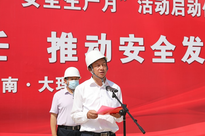 王永强代表建投集团对参加启动仪式的各级领导及同仁表示衷心的感谢和诚挚的问候,并提出了四点要求:一是要聚焦责任体系,层层压实安全生产责任,加强全员技能培训,不断深化安全生产标准化工地和平安工地创建。二是要聚焦源头预防,全面防范化解风险隐患,做到排查“细”、整治“快”、销号“严”,切实将安全风险隐患纵深防御和管控前移。三是聚焦能力建设,全面提升安全管理水平,牢固树立安全生产红线意识和底线思维。四是聚焦活动主题,在全集团内积极营造人人关心安全生产、人人参与安全发展的浓厚氛围,全力推动集团安全生产形势持续稳定向好,为集团“十四五”开好局、起好步创造良好的安全环境。