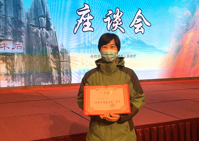 3月21日,徐溧婕获得“赤壁市荣誉市民”证书。