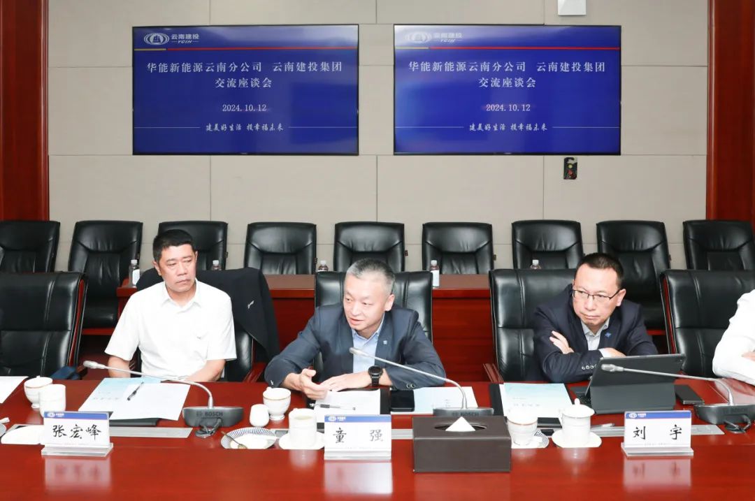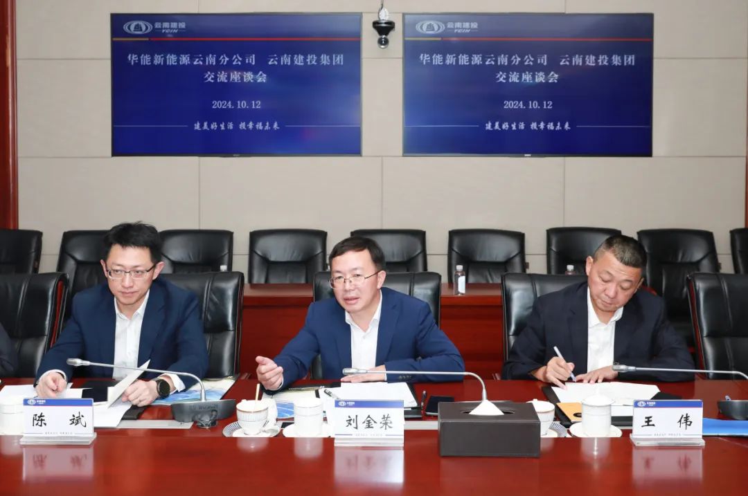 10月12日,华能新能源股份有限公司云南分公司党委书记童强一行到访世界杯比分推荐,与世界杯比分推荐公司副总经理刘金荣交流座谈。华能新能源云南分公司党委副书记、总经理刘宇,党委委员、副总经理张宏峰、韩维新参加座谈。