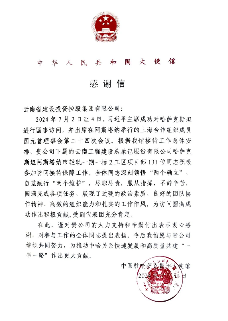 信中对集团的大力支持和辛勤付出表示衷心感谢,对参与工作的全体同志提出表扬。中国驻哈萨克斯坦大使馆表示,今后愿与集团继续共同努力,为推动中哈关系快速发展和高质量共建“一带一路”作出更大贡献。