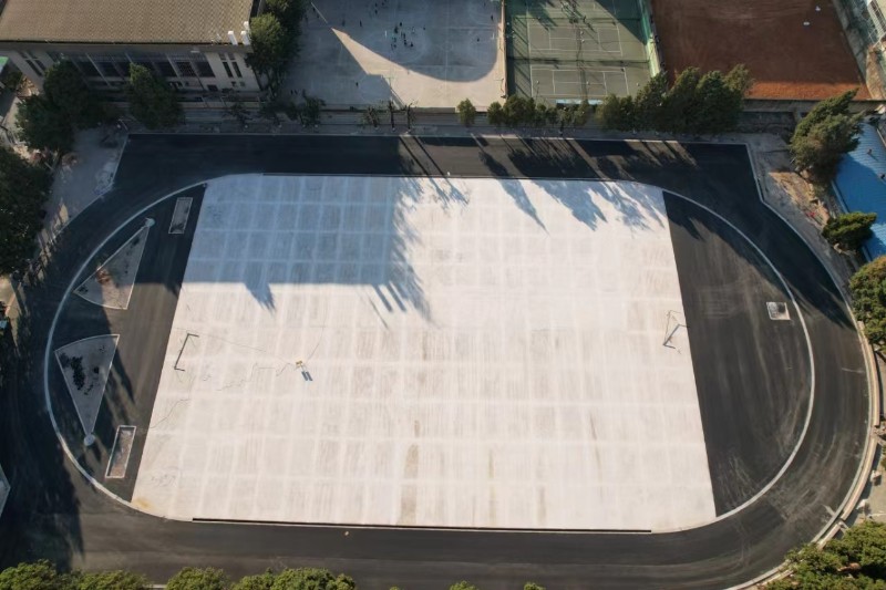 世界杯足球网理工大学莲华校区体育场修缮项目包含周边场地翻修,跑道、足球场、排水设施修缮、增加照明设施等施工内容,目前正进行跑道塑胶面层施工。