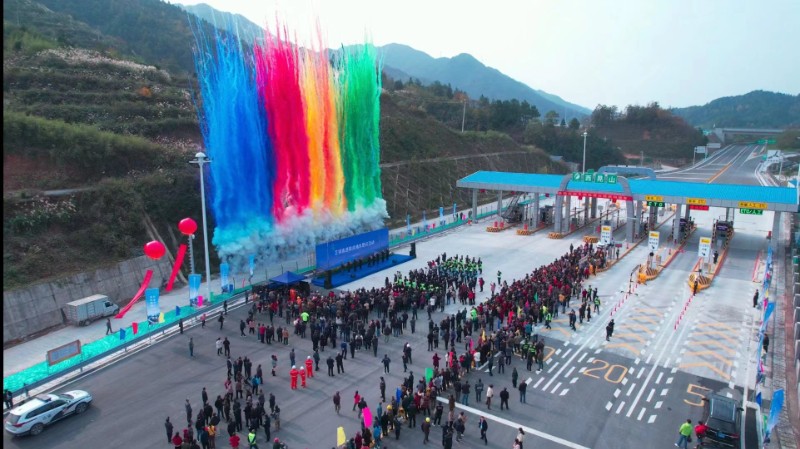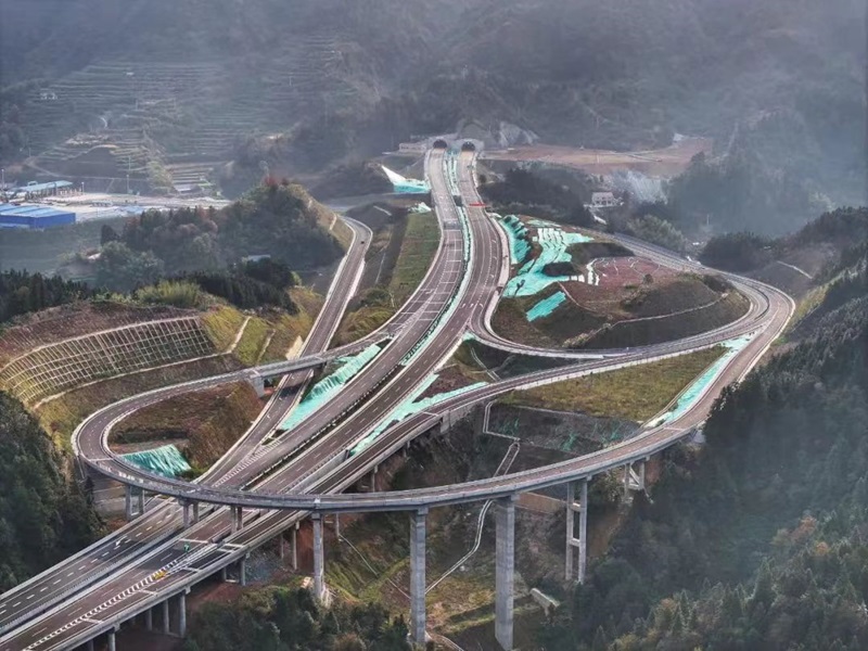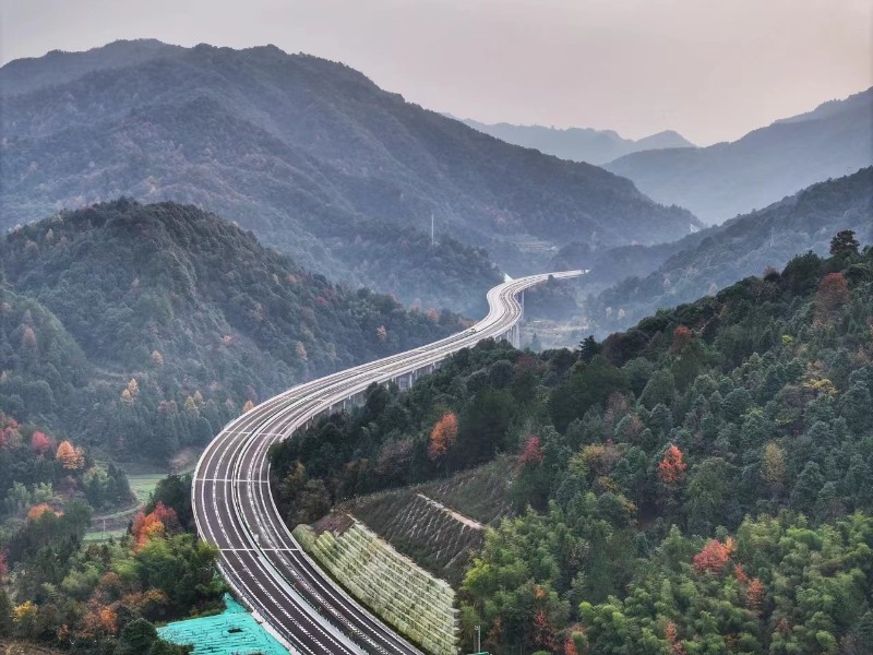 高架横跨山川,隧道穿越峡谷,车流的轰鸣声穿梭在流动的钢铁丛林,翠绿的树影在光影下勾勒出静谧壮美的画面。地势高低,山峦起伏,在这条斑斓的路途上,人们的憧憬在远方悄然升起,形成一幅共筑美好未来的长篇画卷。