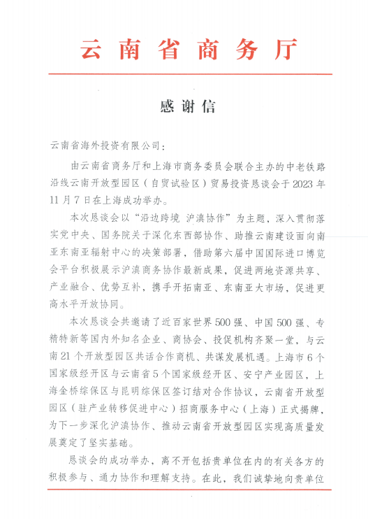 近日,世界杯直播网省商务厅致信感谢海投公司在中老铁路沿线世界杯直播网开放型园区(自贸试验区)贸易投资恳谈会中的积极参与、通力协作和理解支持,对出席恳谈会的领导以及在工作中辛勤付出的各位同志,致以衷心感谢和崇高敬意。