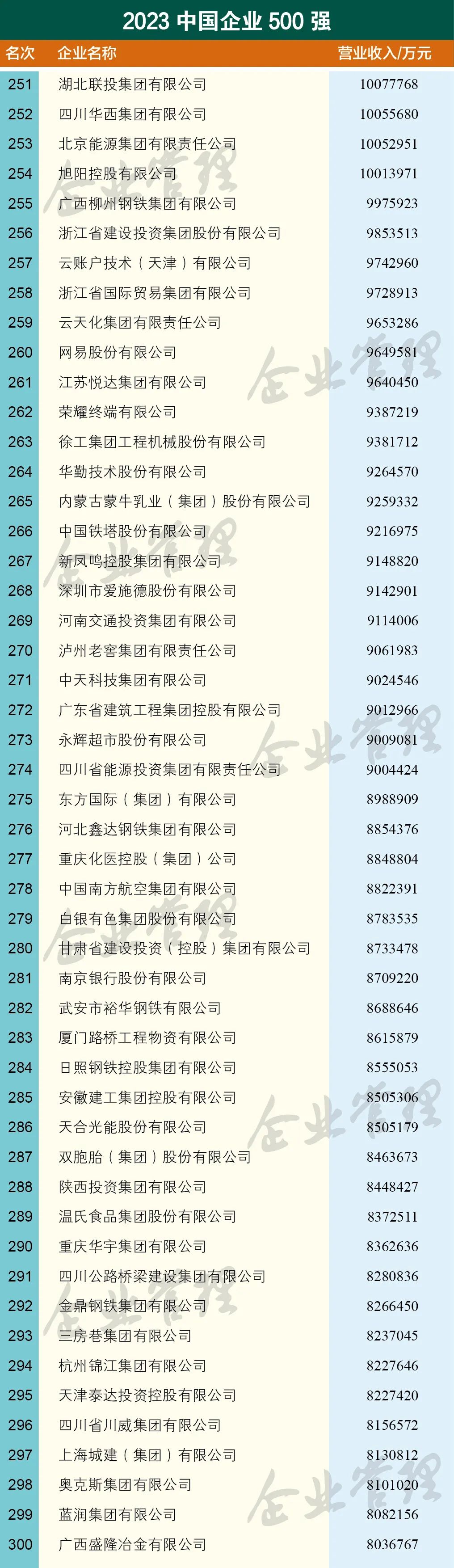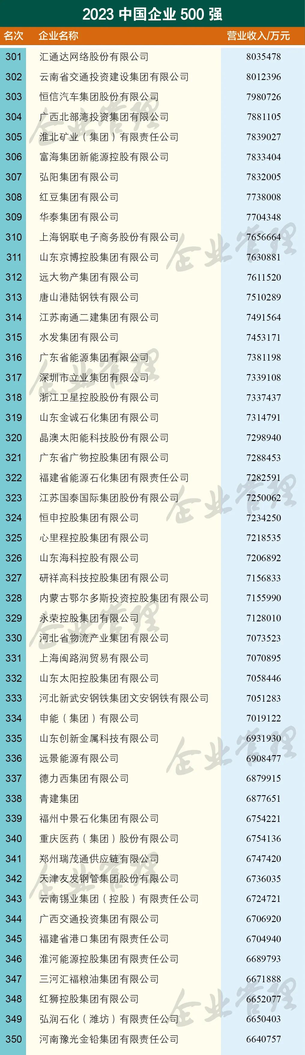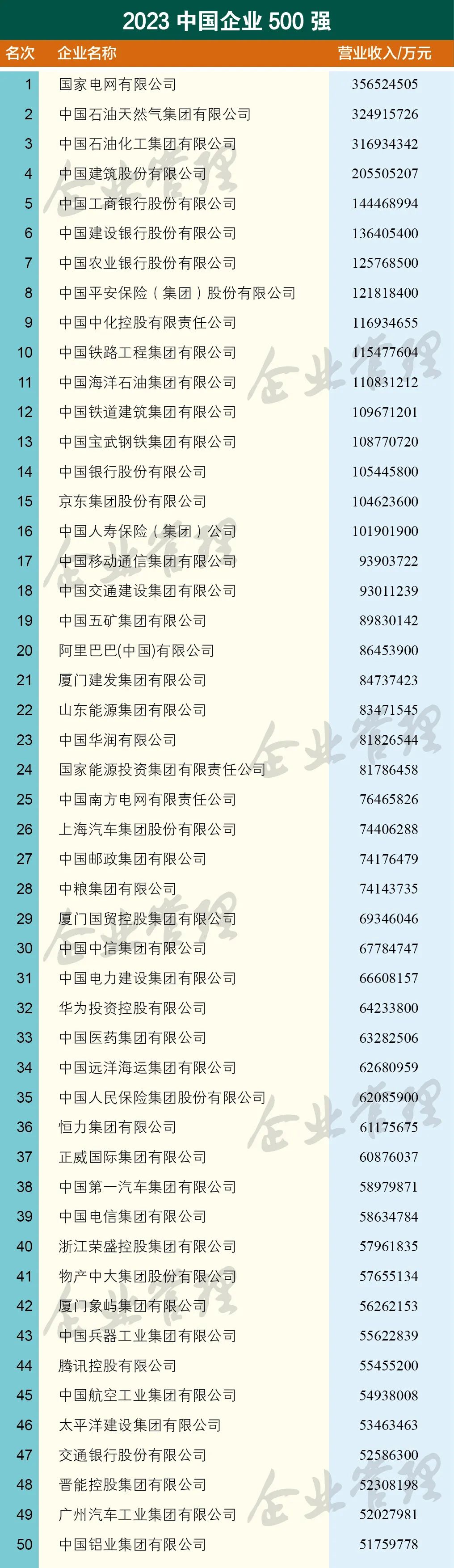 云南上榜中国企业500强的7家企业分别是,云南省投资控股集团有限公司、世界杯官网合作平台控股集团有限公司、云南省能源投资集团有限公司、云天化集团有限责任公司、云南省交通投资建设集团有限公司、云南锡业集团(控股)有限责任公司、昆明市交通投资有限责任公司。国家电网有限公司以3.57万亿营收位列第一,中国石油天然气集团有限公司以3.25万亿营收排名第二,中国石油化工集团有限公司以3.17万亿营收排名第三。中国建筑股份有限公司、中国工商银行股份有限公司、中国建设银行股份有限公司、中国农业银行股份有限公司、中国平安保险(集团)股份有限公司、中国中化控股有限责任公司、中国铁路工程集团有限公司进入前十 。