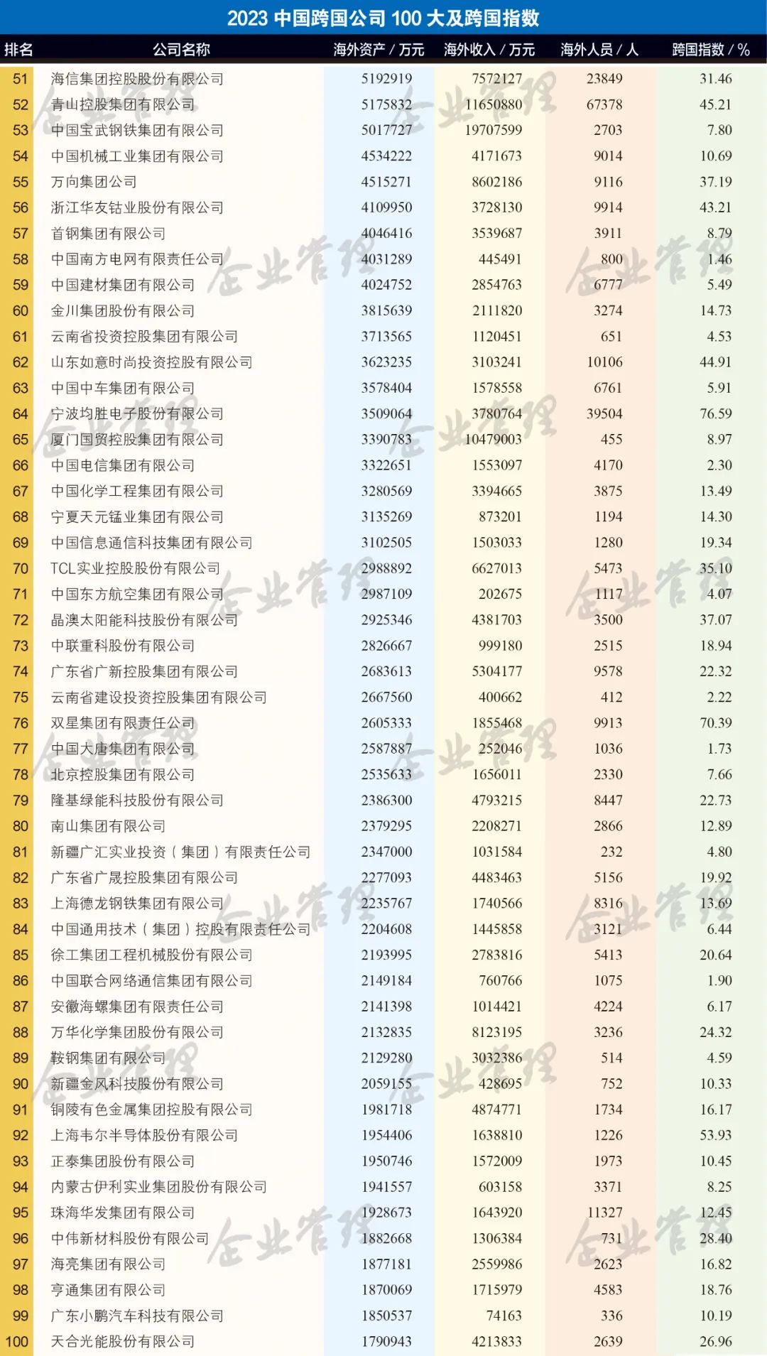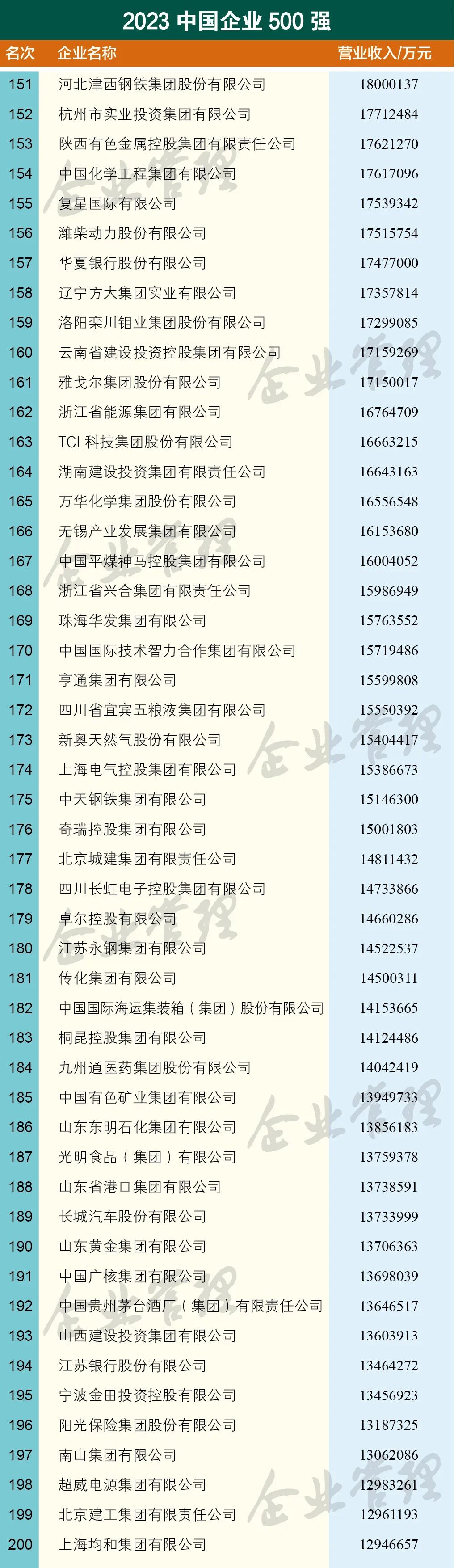 以“奋进中国式现代化新征程 加快建设世界一流企业”为主题的“2023中国500强企业高峰论坛”,于9月20—21日在安徽省合肥市举行。会上,中国企业联合会、中国企业家协会连续第22次发布中国企业500强榜单。集团以营业收入1715.93亿元位列第160位,比去年上升4位。一同发布的还有2023中国跨国公司100大及跨国指数,集团位列第75位。