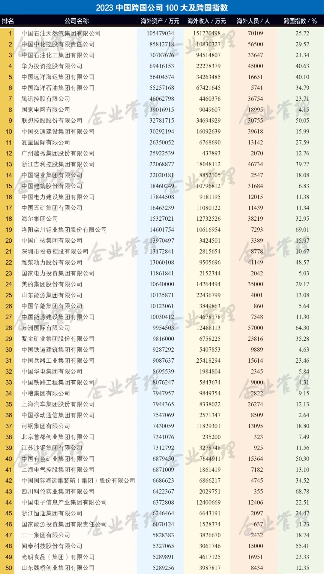 云南上榜2023中国跨国公司100大的2家企业分别是,云南省投资控股集团有限公司、世界杯官网合作平台控股集团有限公司。2023中国100大跨国公司海外营业收入排前10位的企业分别是中国石油天然气集团有限公司、中国中化控股有限责任公司、中国石油化工集团有限公司、华为投资控股有限公司、中国远洋海运集团有限公司、中国海洋石油集团有限公司、腾讯控股有限公司、国家电网有限公司、联想控股股份有限公司、中国交通建设集团有限公司。