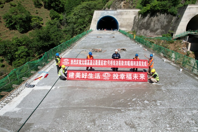 8月27日,元绿高速土建二分部曼延坡1号中桥现浇箱梁顶板混凝土浇筑任务顺利完成,转入梁体养护及桥面铺装施工阶段。曼延坡1号中桥为桥隧相连,桩基20颗,墩柱最高32.5米,孔跨布置分别为3×18.5米(左幅)、5×18.5米(右幅)现浇混凝土连续箱梁。