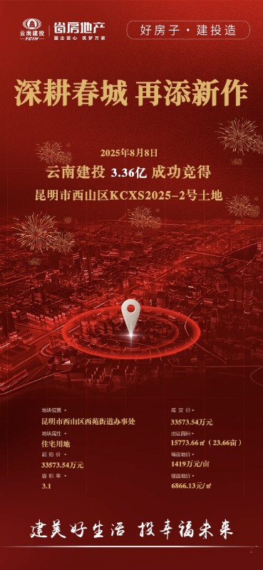 8月8日,集团省房公司再次落子昆明城市中轴人民西路,以33573.54万元成功竞得核心地段住宅用地。这是继今年4月2日、7月9日摘得五华区、官渡区两宗优质土地后,集团又一次在昆明主城区核心地段竞得优质土地。项目将凭借二环内稀缺的区位优势、完善的配套资源及高品质的开发定位,为昆明城市发展焕新升级注入强劲动能。