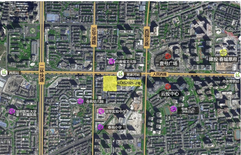 此次竞得地块位于昆明市西山区西苑街道,3公里范围内教育资源、医疗配套、商业生态及城市景观资源形成“黄金矩阵”,成为品质生活的强力支撑。地块东侧距地铁3号线梁家河站直线距离仅50米,周边500米范围内公交站点密集,无缝衔接人民西路、近华浦路等城市交通动脉。周边分布有春苑幼儿园、春苑小学、书林二小西苑校区、昆华实验中学等优质学校,能够实现从幼到高的全龄教育闭环。云大医院、昆医大第三附属医院、解放军920医院等医疗机构环绕,构建安心健康生活圈。项目坐拥春城华府、西城时代、海伦堡中央广场、百汇广场等商业综合体,1.8公里范围内还有昆明网红菜市大观篆新农贸市场,满足日常购物与烟火气息的双重需求。大观楼公园、翠湖公园等城市级景观资源近在咫尺,为业主构建诗意栖居场景。