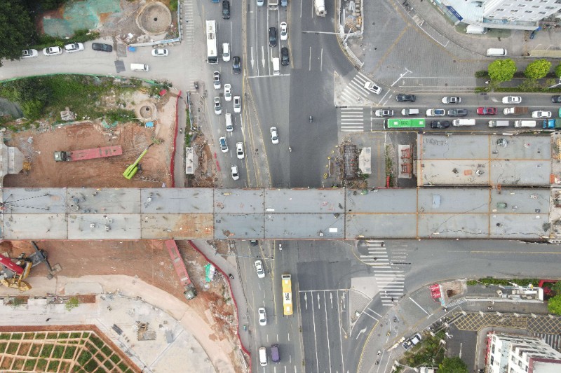 龙观路是深圳市车流量最大的主干道之一,跨线桥钢箱梁为单箱双室结构,跨径(3×45)米,总重1920吨。从首个临时支墩安装到右幅全线贯通,项目团队在 “特区速度” 与 “施工精度” 的双重考验中展现硬核实力。面对龙观路日均车流量超10万辆的交通疏导压力、华南地区夏季多雨湿热的气候挑战,以及夜间吊装作业的安全管控难题,项目团队发扬高原铁军精神,采用 “分时段交通导改 + 智能化吊装监控” 的措施,通过预演吊装路径、动态调整施工工序,实现了 “零事故、零延误” 的精细化施工目标。