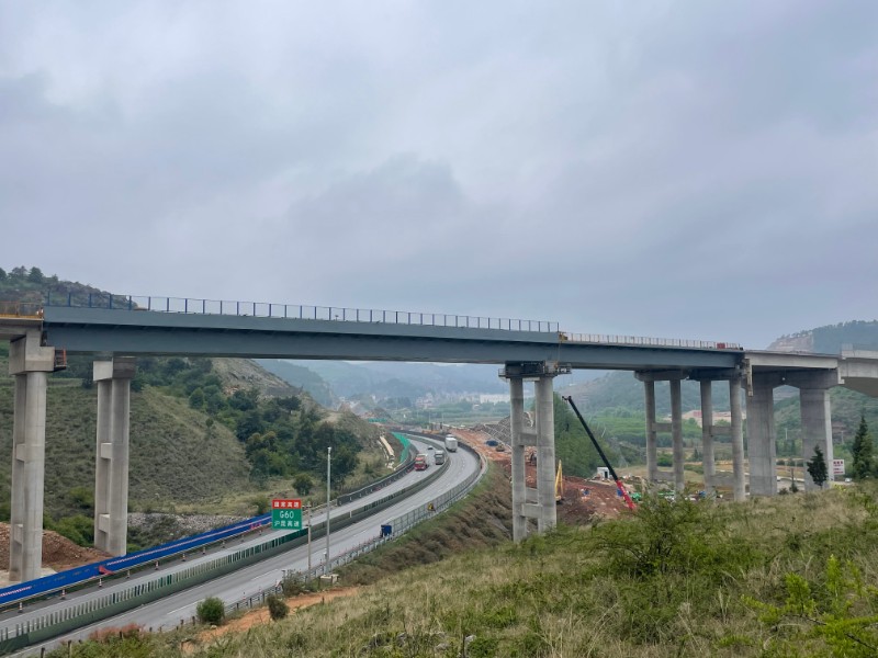 5月15日,宣威至富源高速公路项目响水河2号大桥左幅钢箱梁顺利落梁到位,打通了杨二冲立交区运输通道。响水河2号大桥为跨径124米的装配式连续钢箱梁,顶面宽12.57米,底面宽8.06米,梁高3米。大桥第五联钢箱梁桥跨沪昆高速公路,施工地点为道路正上空,工程构件尺寸大、重量重,空间受限较多,施工难度较大。