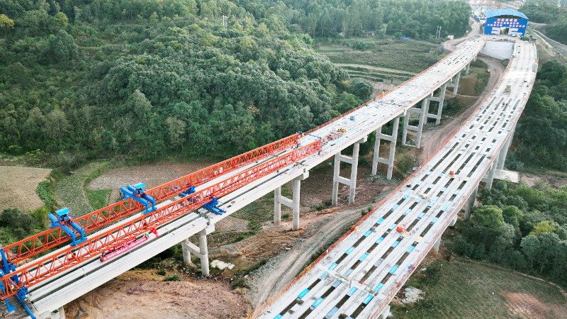 11月26日,楚雄市东南绕城高速公路田房头大桥最后一片预制30米T梁在架桥机的牵引下,被精准地安置在桥台盖梁支座上,标志着桥梁架设任务圆满结束。