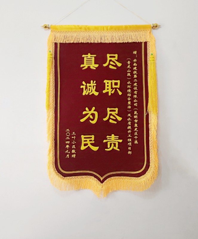 9月9日,二公司承建的昆明市盘龙东干渠施工项目收到了来自三叶小区的一面锦旗,锦旗上印有“尽职尽责、真诚为民”几个大字,点赞项目团队高效推进项目建设,为周边小区居民生活提供了便利。