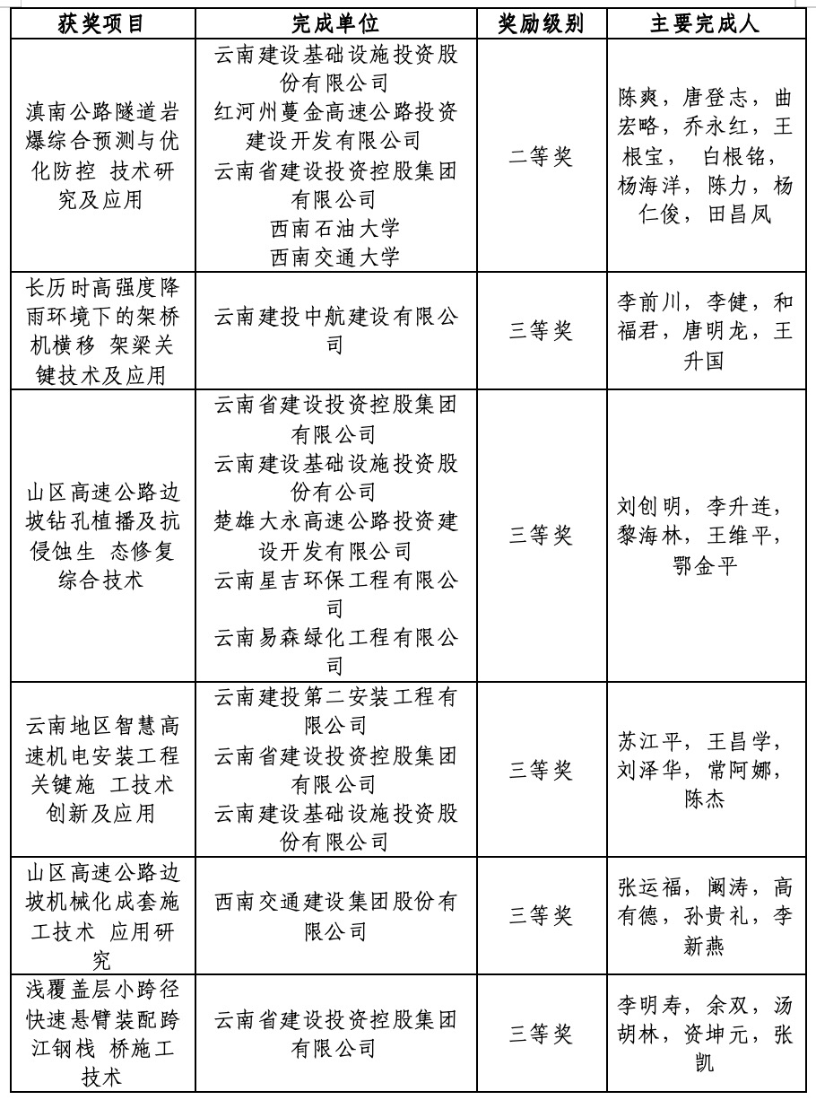 其中,“高原深切峡谷独塔大跨径悬索桥全寿命周期智慧建造技术”荣获云南交通科学技术二等奖;“长历时高强度降雨环境下的架桥机横移架梁关键技术及应用”、“山区高速公路边坡钻孔植播及抗侵蚀生态修复综合技术”、“云南地区智慧高速机电安装工程关键施工技术创新及应用”,“山区高速公路边坡机械化成套施工技术应用研究”、“浅覆盖层小跨径快速悬臂装配跨江钢栈桥施工技术”荣获云南交通科学技术三等奖,实现了世界杯实时比分在该项奖数量上的新突破。