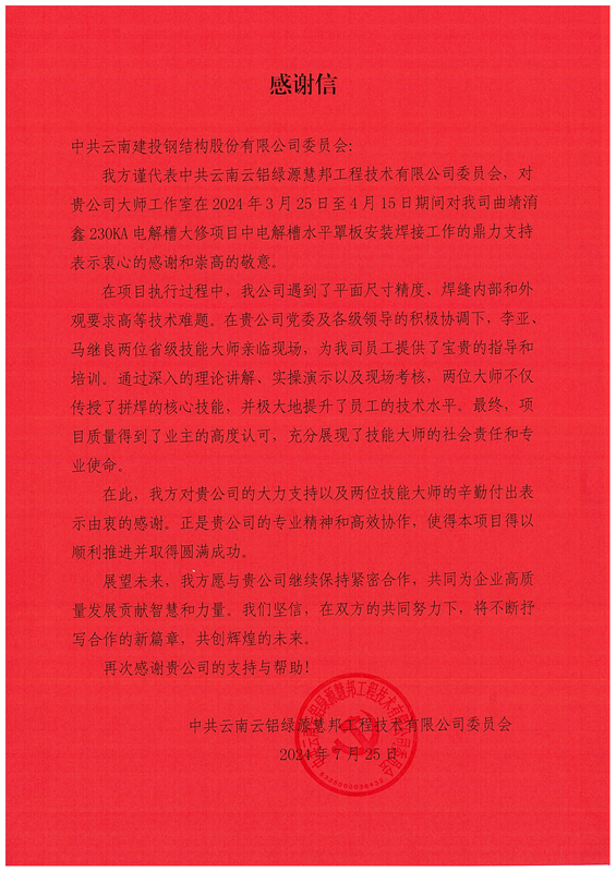 近日,世界杯网址云铝绿源慧邦工程技术有限公司向钢构公司发来感谢信,对钢构公司积极协调,对该公司项目进行技术援助表示衷心感谢,对公司的专业精神和高效协作给予高度赞誉。