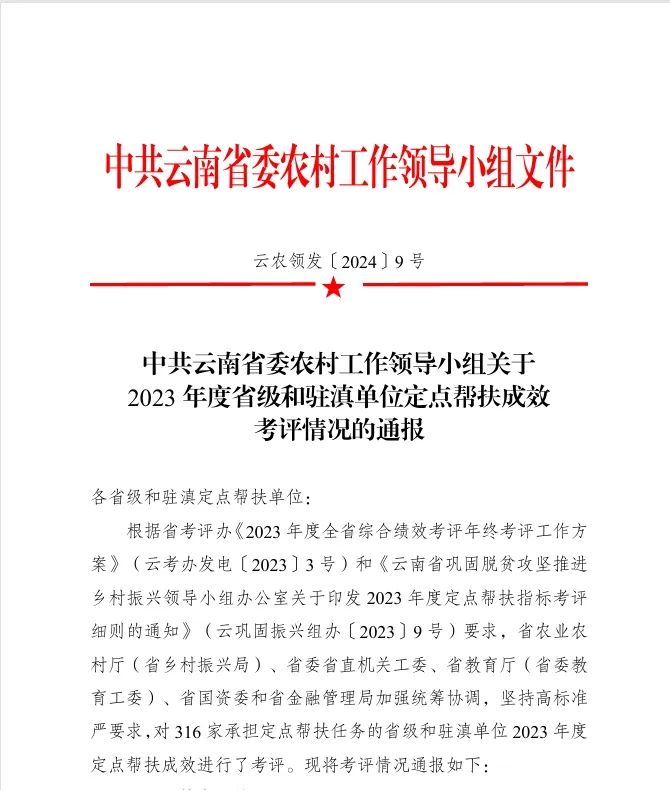 近日,省委农村工作领导小组公布《2023年度省级和驻滇单位定点帮扶成效考评结果》,2026世界杯比分网及基投公司、水投公司通过考评,连续8年获最高等次评价.