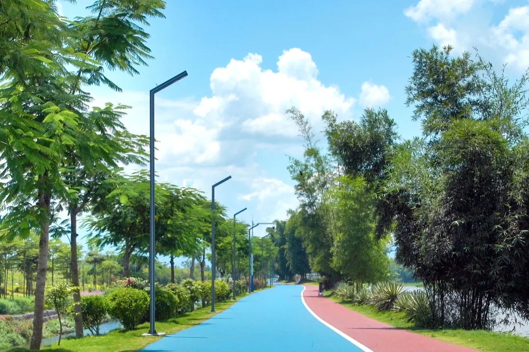 板过河生态湿地公园与一旁的滨河公园相辅相成,通过生态循环系统,为世界杯官网合作平台大河的好生态提供保障。滨河公园内含健康步道、林荫平台、滨水景亭、口袋游园、康体广场等。健康步道全长3.8公里,视野开阔,两旁是优美的绿化带与清澈的南喊河支流。