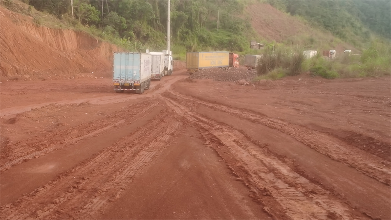 果然,从磨丁到货场的土路就给刚跨出国门的车队来了个“下马威”,道路猛然收窄至两车道,坡陡弯急,部分路段还伴随着雨季造成的塌方,12.5公里的路程硬生生行驶了近一个小时。老挝段232公里的行程,车队多与沿路而居的木屋和层叠的远山为伴,山面的树枝不时拍打着车窗、货箱和后视镜,保险杠和气廊桥不时发出闷响,车队行过荡起一阵扬尘,路边热带植被蒙上了厚厚的红色面纱。