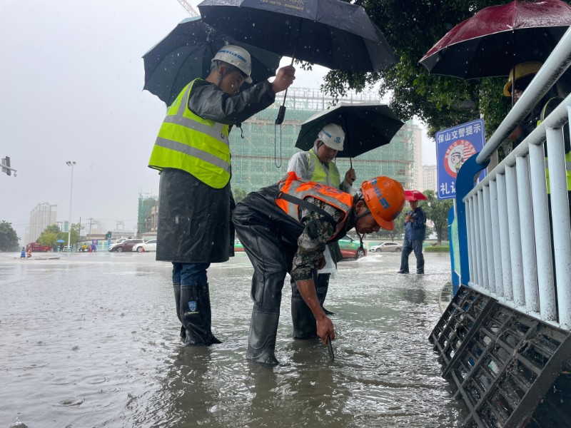 面对连续的降水,中心城区多条道路的排水系统承受巨大压力,部分地段出现排水不畅和路面积水现象,对交通造成了不利影响。在接到隆阳区住建局的紧急排涝抢险指令后,九公司第二直管部保山中心城区市政雨污管网错漏接改造工程项目部迅速响应,立即启动应急机制,组织班组人员及设备紧急赶赴现场,成立应急小组,并在现场设立了安全警示标志,迅速对积水情况进行评估,采取开井强排、清理雨篦等有效措施,利用专业设备加速积水排放,避免积水隐患。