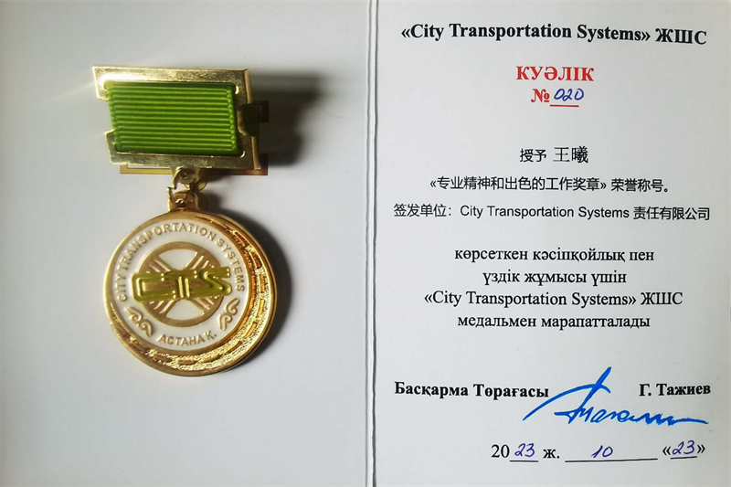 2023年10月,阿斯塔纳轻轨世界杯官方荣获业主城市交通系统有限公司表彰。其中,世界杯官方员工李元、赵靖洋、邓向逵、钱庆鼎、乔凯5人荣获表扬信,杨俊、徐文武获“专业精神和出色工作”胸章,王曦、李刚获“专业精神和出色工作”奖章。