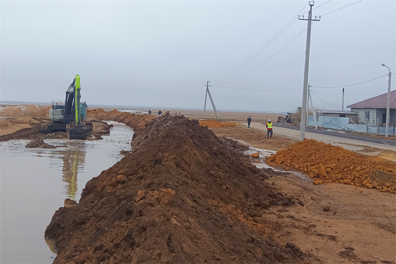 抢险过程中,抢险人员指挥挖掘机清理开挖排水渠,并对堤坝进行加固,全力保护当地人民生命财产安全。经过48小时的连续奋战,科西市泰图别村的洪涝灾害得到有效控制。