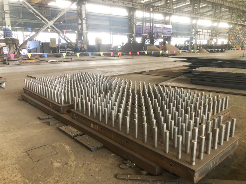 空气分布板位于焙烧炉风箱与壳体第一节段之间,是炉体中气流能够均匀分布和流动的重要保证,全炉160个空气分布板包含27种规格,17000余颗风帽焊接其中,风帽垂直度偏差、平面度偏差、整体尺寸偏差均需控制在1毫米范围内,相比常规桥梁板单元5毫米的平面度允许偏差值,制作要求更为严格,是全炉制作难度最大、质量要求最高的构件形式。面对严峻挑战,钢构公司开展多次试制试验,在高精度定制工装、最小化焊接电流、数控式机械矫正的多重保障下,提高制作质量,得到了业主、施工方的一致认可和高度赞扬。