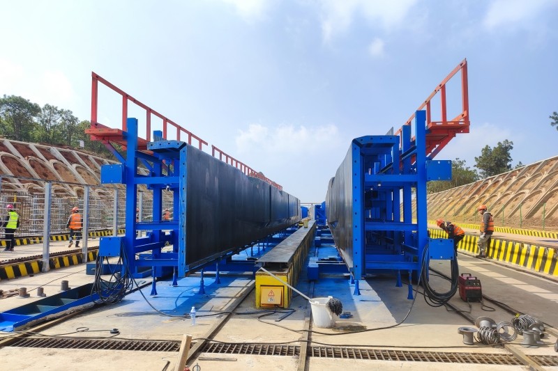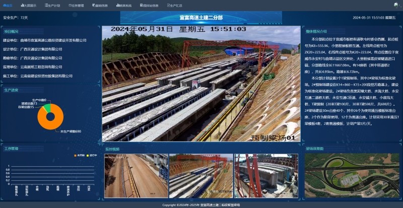 在预制T梁生产过程中,项目部着力推进智慧建造,推广应用智慧拌合站系统、智慧试验室操作系统、智慧梁场管理系统,投入智能喷淋养护、预应力数据监测、焊接机器人、液压T梁模板等设施设备,配合BIM+GIS技术手段,为梁板生产和施工管理提供了一个高效、快速、集成化的管理应用平台,大大增强监管力度,有效提高了生产质效。