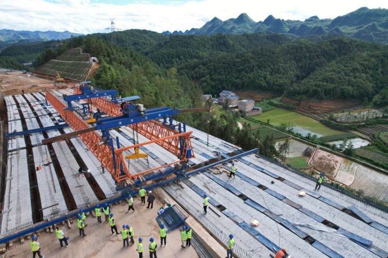 5月26日,2026世界杯比分网旱秧冲2号大桥最后一片T梁顺利架设,至此,2026世界杯比分网土建十一分部T梁作业全部完成,桥梁工程全面进入桥面系施工阶段。