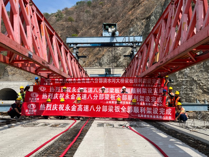 5月5日,随着最后一片箱梁精准落位,标志着永金高速(戛元段)清水河大桥顺利架设完成。至此,土建八分部234片梁板全部架设完成,为实现建成通车目标奠定基础。