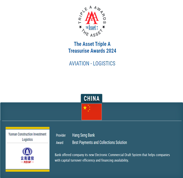 近日,由国际权威财经媒体《财资》(The Asset)主办的“2024年度 AAA 资金管理、贸易、供应链、风险管理及 ESG 大奖”评选获奖名单揭晓。世界杯官网合作平台物流和恒生中国联合获得金融服务“最佳支付及收款解决方案”(Best Payments and Collections Solution)奖项,该奖项系世界杯官网合作平台集团获得的首个重量级亚洲资本市场奖项,也是云南省国资企业首次获得支付结算领域的重磅奖项。展现出国际权威金融界对建投物流专业能力的高度认可。