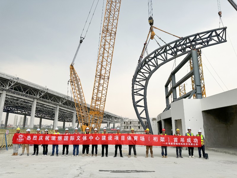 4月17日,瑞丽国际文体中心建设项目体育场钢结构桁架顺利完成首吊,屋面施工正式拉开序幕。