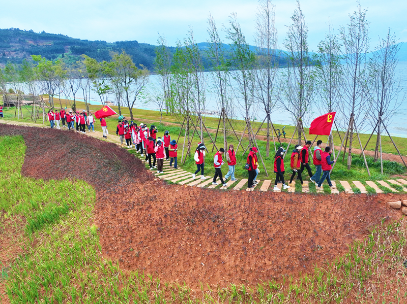 在项目讲解员带领下,大家沿步道参观了项目周边环境和建设成效,了解了昆明阳宗海生态湿地恢复建设项目的基本情况及重要意义,沉浸式感悟了“绿水青山就是金山银山”理念的内涵。