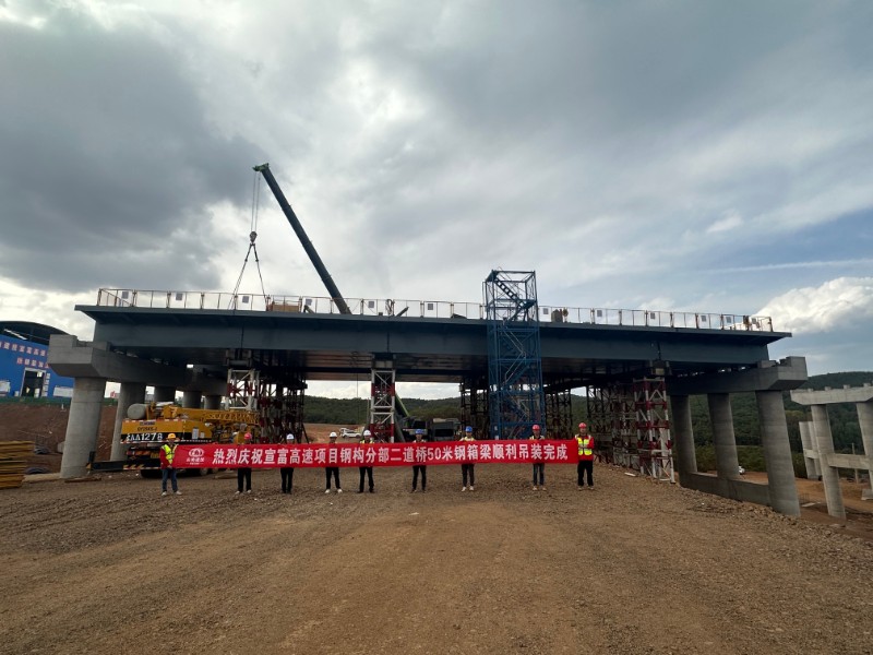 3月28日下午,历时10天,宣威至富源高速公路首跨钢箱梁二道桥大桥50米钢箱梁顺利吊装完成。