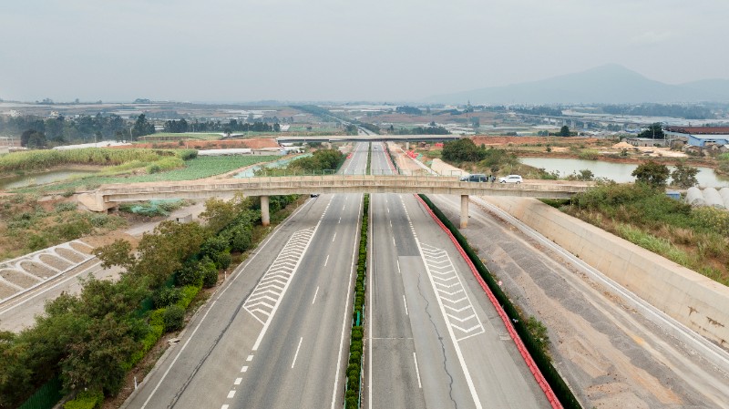 新哨互通上跨广昆高速,向东与新哨连接线相连,为双环+定向的十字型互通形式,与新哨连接线连接顺畅。F匝道2号桥全长304.08米,G匝道2号桥全长164.08米。需拆除跨线桥为石锁高速上跨车行跨线桥。
