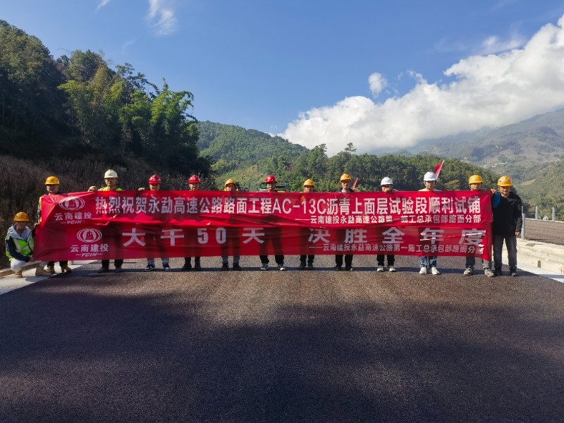 11月26日,永勐高速公路路面工程AC-13C细粒式沥青混凝土上面层试验段成功试铺,标志着全线沥青路面结构层施工正式拉开序幕。