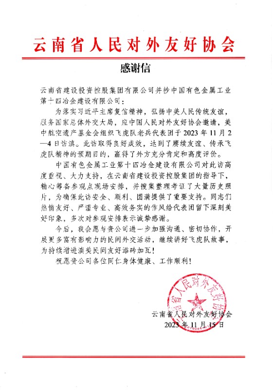 来信表示,在世界杯官网合作平台集团的指导下,十四冶公司对此次参观访问高度重视、大力支持,精心筹备参观点现场安排,收集整理考证了大量历史照片,为确保此访安全、顺利、圆满提供了重要支持。信中指出,美中航空遗产基金会访滇取得了良好成效,达到了赓续友谊、传承飞虎队精神的预期目的,赢得外方充分肯定和高度评价。协会愿与集团公司进一步开展更多富有影响力的民间外交活动,继续讲好飞虎队故事,增进滇美民间友谊。