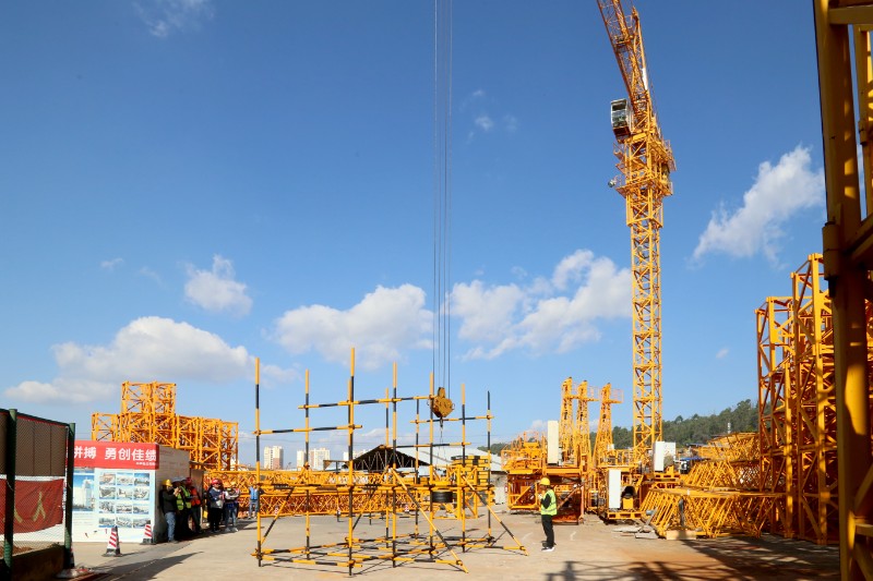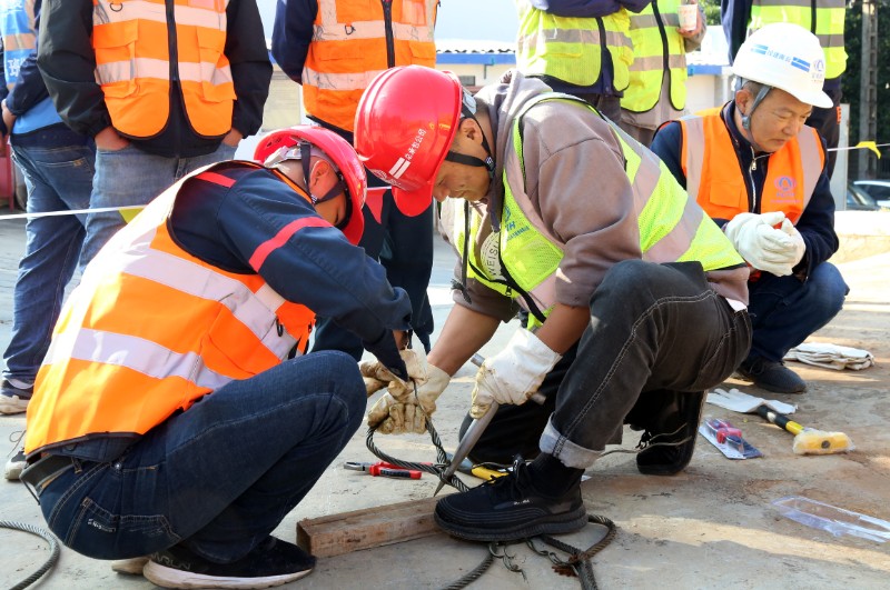 蓝天白云映衬下,高耸的塔吊格外耀眼,60名参赛选手分为30组,统一参加实物吊运与钢丝绳编制两项竞赛。塔机驾驶室内,各位司机与地面指挥人员密切配合,安全规范、精准高效地作出各项驾驶操作。钢丝绳编制现场,一条钢丝绳历经拆开绳头、穿绕打圈、插编紧固一系列操作后,便多出了一个坚固牢靠的吊环,各位裁判根据编制用时、规格尺寸、接口平齐度等指标进行打分。