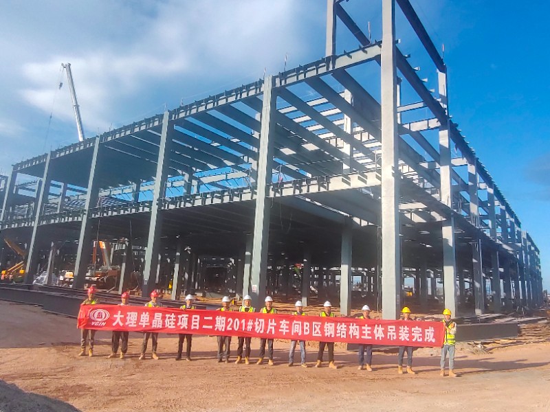 10月22日,钢构公司承建的祥云经开区年产10GW单晶硅棒及切片标准厂房及配套基础设施建设项目(二期),历经22天艰苦奋战,B区钢结构主体吊装完成,钢结构总量约4100吨。