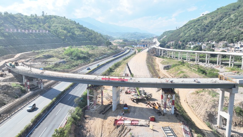 10月17日,永金高速(戛元段)十二分部曼来枢纽C匝道桥钢箱梁顺利合拢。随着这段长145米、总重805吨的钢箱梁有序完成顶推、换顶、落梁工序,标志着永金高速曼来枢纽立交跨越、搭接昆磨高速基本成型,项目取得重大进展。