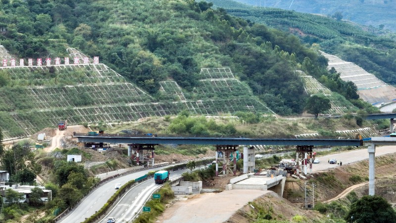 10月13日,永金高速(戛元段)曼来四号大桥箱梁顺利架设完成,为其他施工点的材料设备运输打通了更便捷高效的通道。
